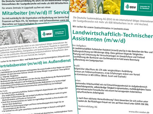 Wenn Sie sich für eine Mitarbeit bei der Deutschen Saatveredelung AG interessieren, bieten wir Ihnen auf den folgenden Seiten Informationen, rund um Beschäftigungsmöglichkeiten bei der DSV. Darüber hinaus erfahren Sie weitere interessante Informationen über die Deutsche Saatveredelung AG in unserer Image Broschüre, die Sie hier herunterladen können.