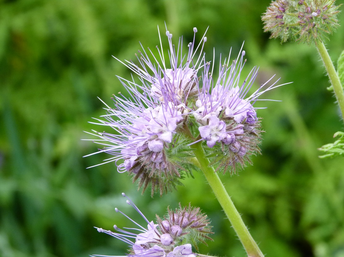 Blüten: weiß bis hellblaue, ährenförmige, schneckenförmig aufgerollte Traube, entfaltet sich während der Blüte